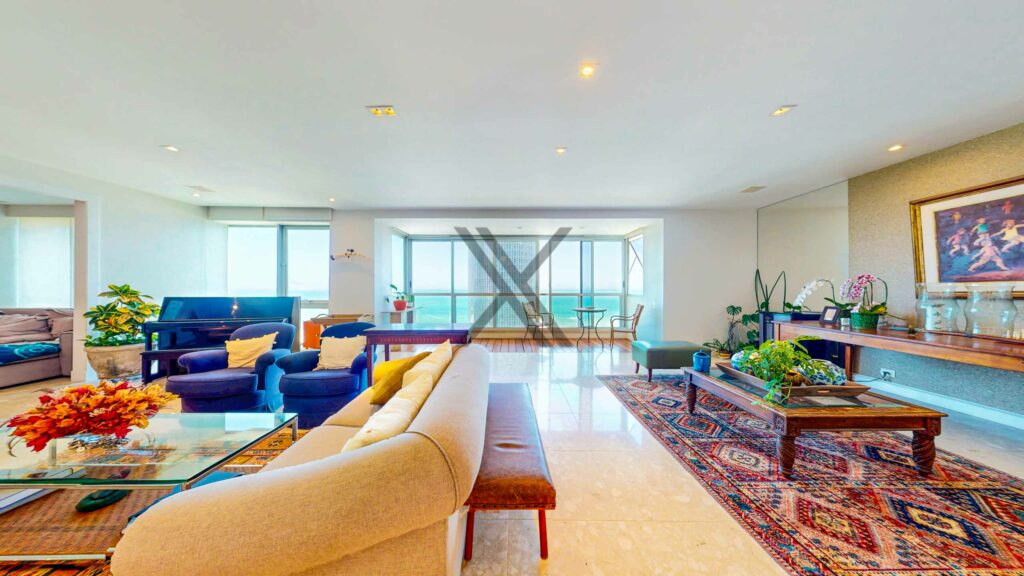 A área social é composta por sala de estar em três ambientes com 88 m², aconchegante varanda (anexada à sala) com vista para o mar, projeto de iluminação, ampla sala de jantar para oito lugares e um lavabo de apoio às visitas.