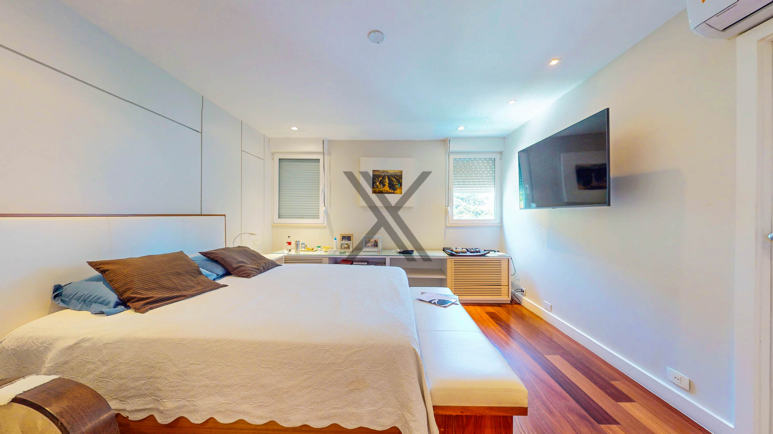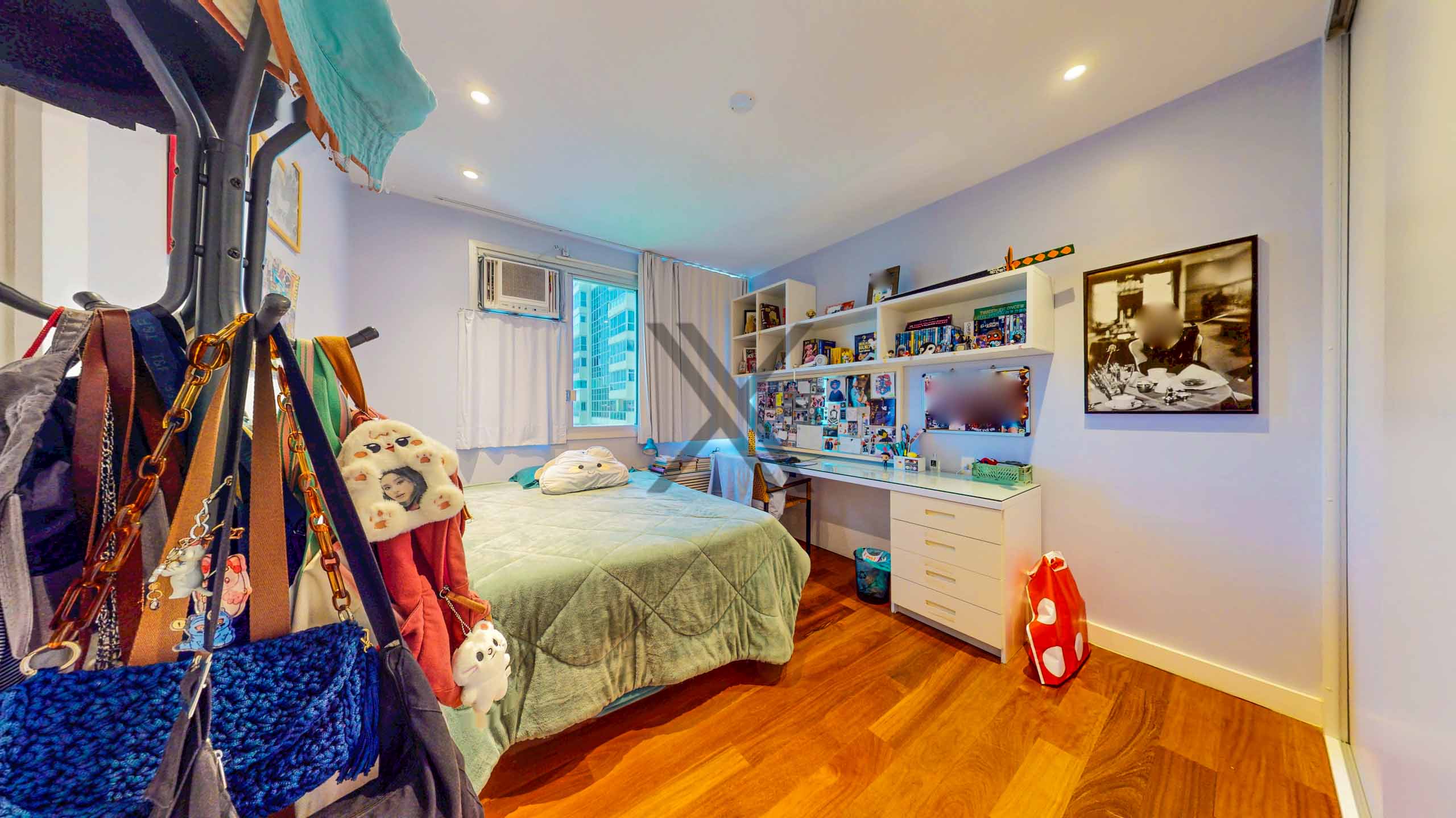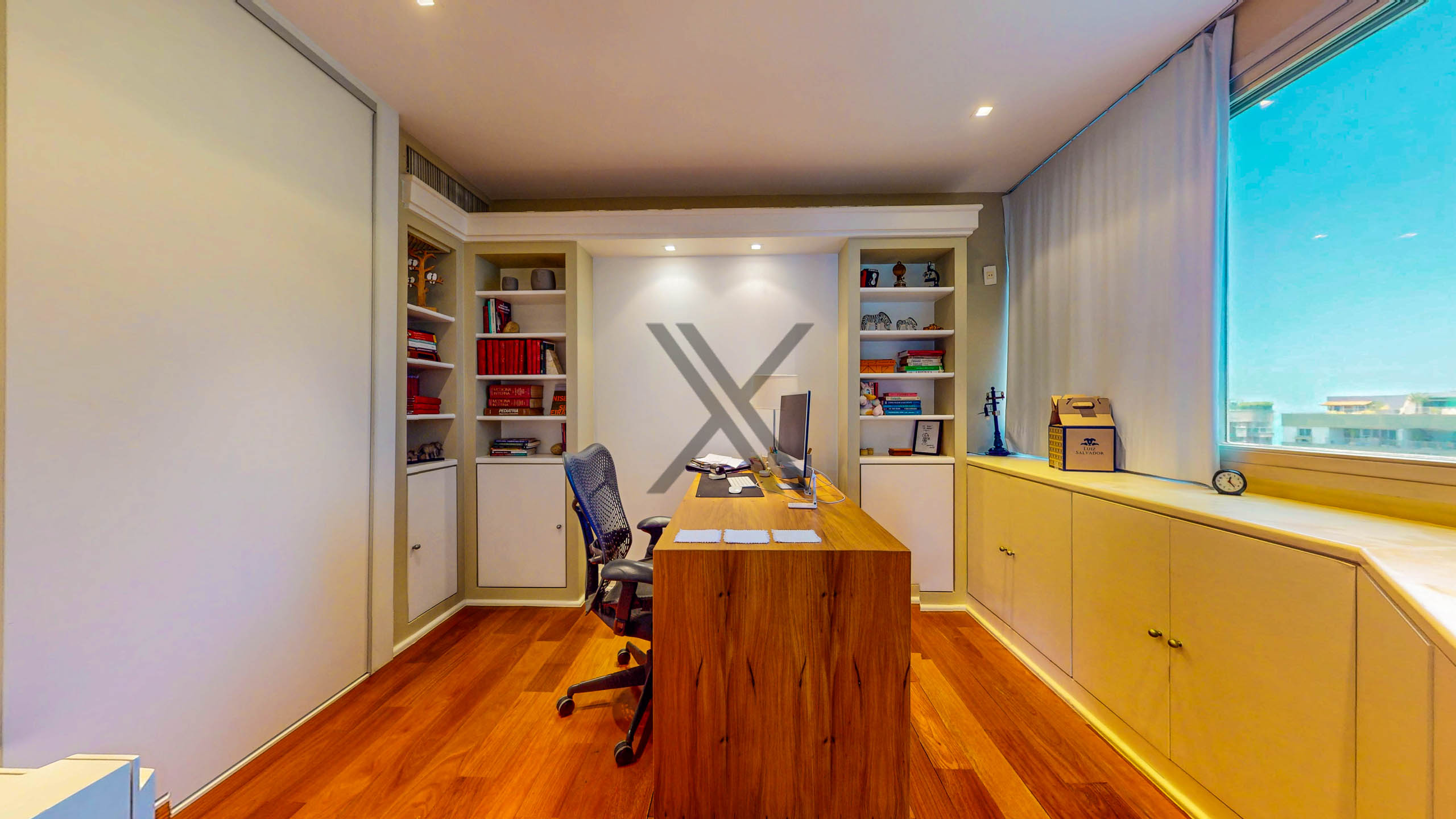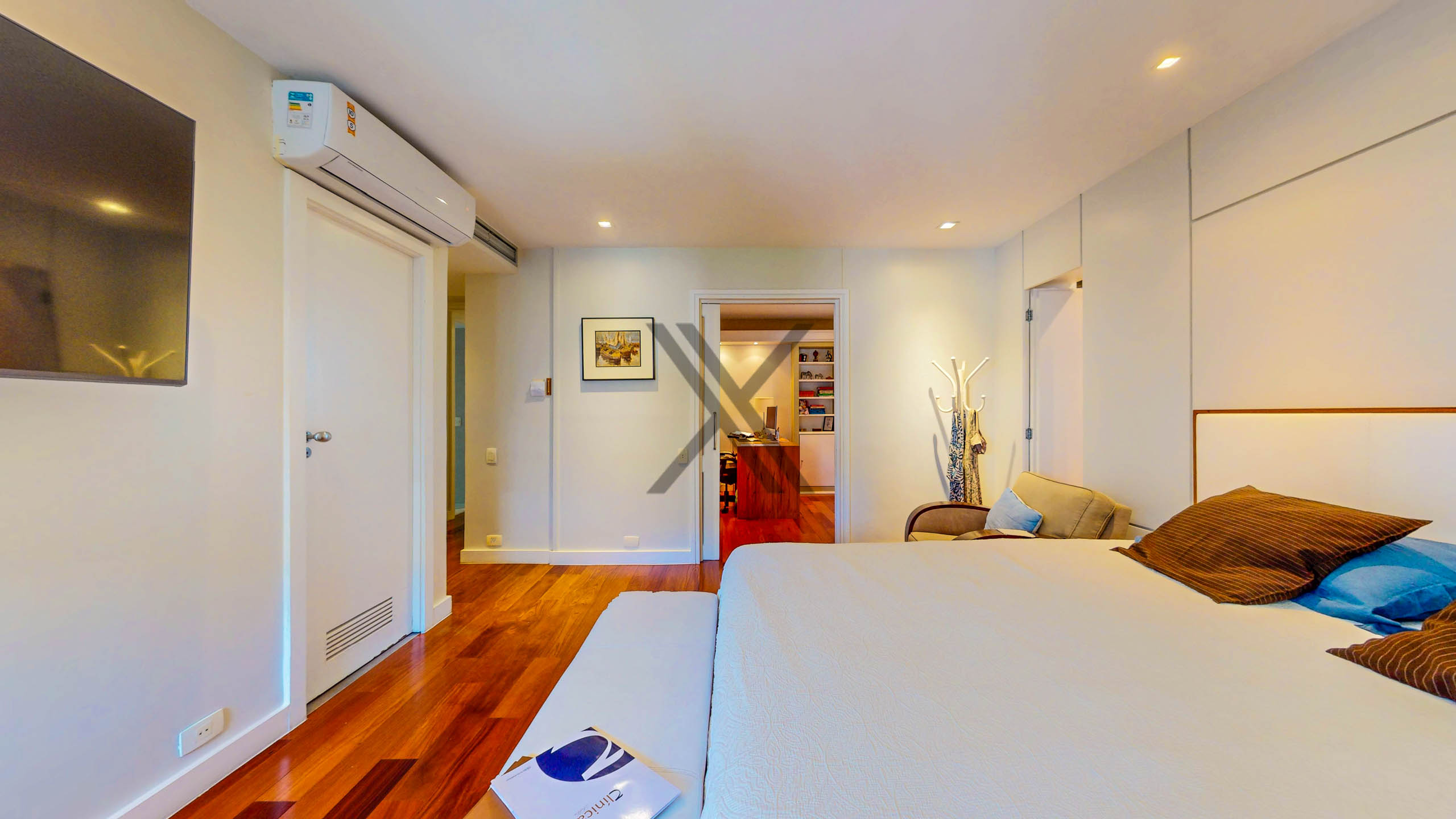 Na parte privativa, atualmente, temos 3 quartos, sendo 2 suítes, todos com boa metragem, grande quantidade de armários e uma excelente ventilação natural com amplas janelas. A suíte master é um show à parte, pois além de um excelente espaço de circulação, possui um escritório anexo, o que originalmente era um dos quartos, e um ótimo walk-in closet, onde era a varanda. Por fim, um banheiro social complementa o ambiente.