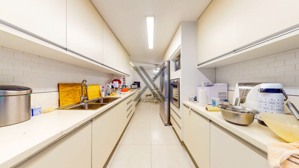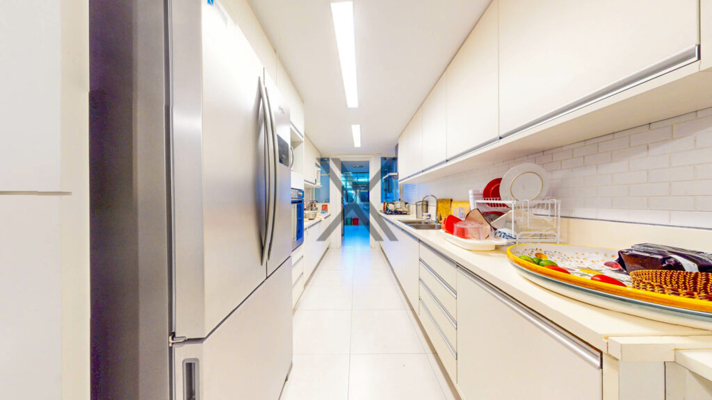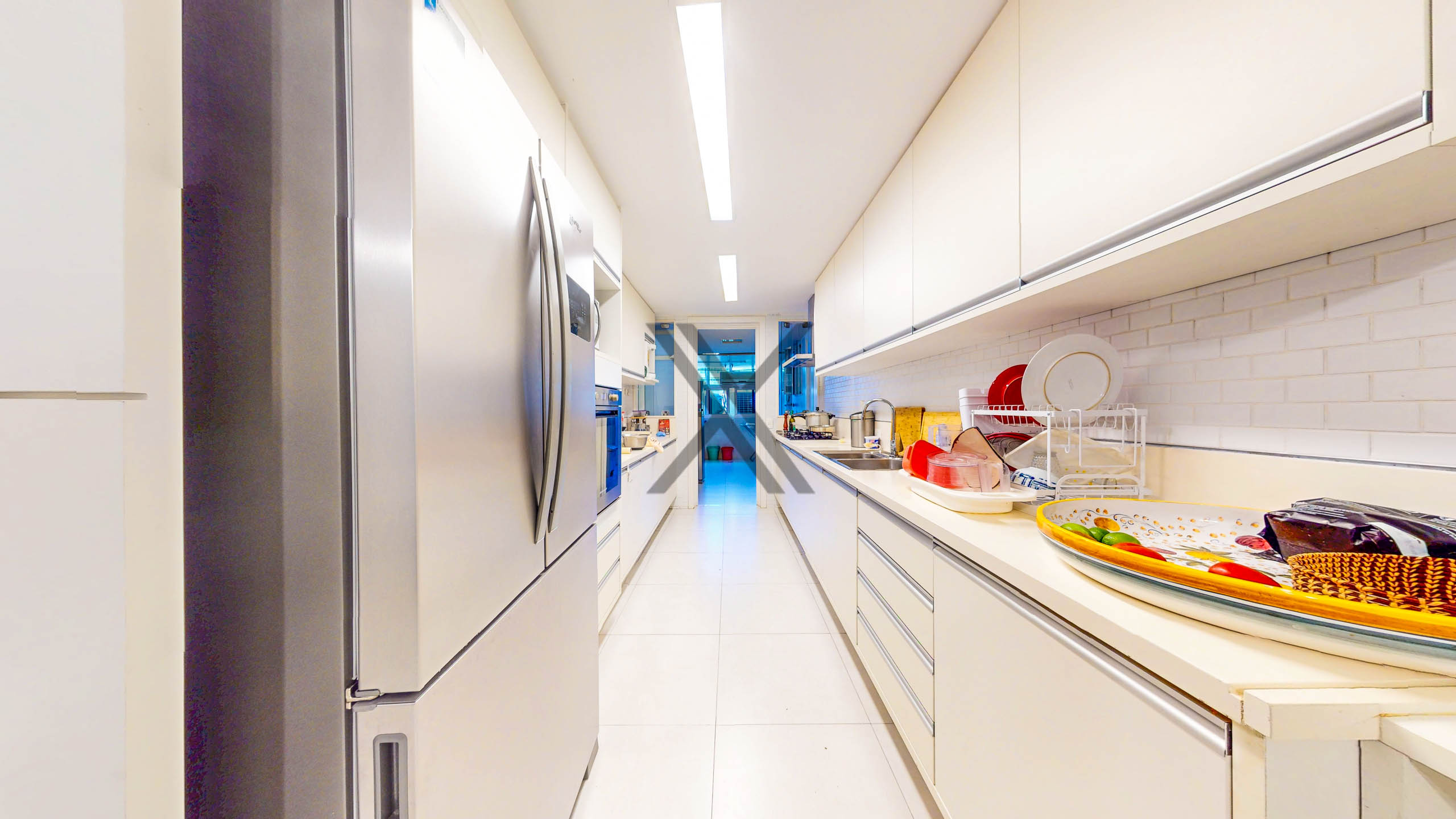 A cozinha possui copa para praticidade do dia a dia dos moradores, farta quantidade de armários e bancadas para apoio e organização, cooktop, coifa e forno elétrico. Em anexo, está uma excelente área de serviço com 2 dependências completas para funcionários.